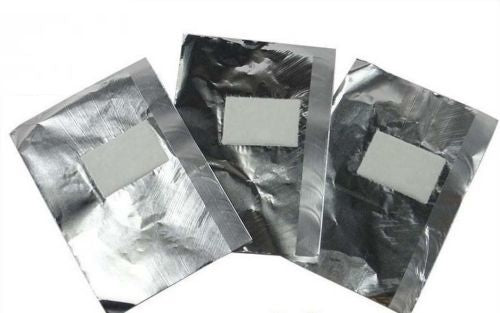 Diese Aluminium Wickel Folien bestehen aus einem kleinen Rechteck Aluminiumfolie und einem kleinen Kissen um das flüssige Material aufsaugen und übertragen zu können. Sie sind wunderbar geeignet, um sie um die angeraute Nagelplatte zu wickeln um das Shellac und Soack Off UV Gel aufzuweichen.